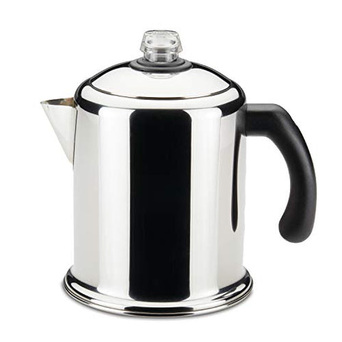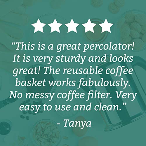 - Durable and convenient: Heavy-duty stainless steel coffee maker is polished to a mirror finish. The sturdy, clear glass knob lets you know when percolating begins