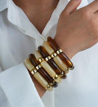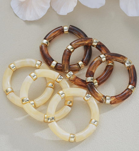 Add a pop of color and modern flair to your look with these Chunky Acrylic Bamboo Tube Bracelets. Each set includes 6 unique bracelets, featuring vibrant tones and a glossy finish that stands out whether worn solo or stacked.